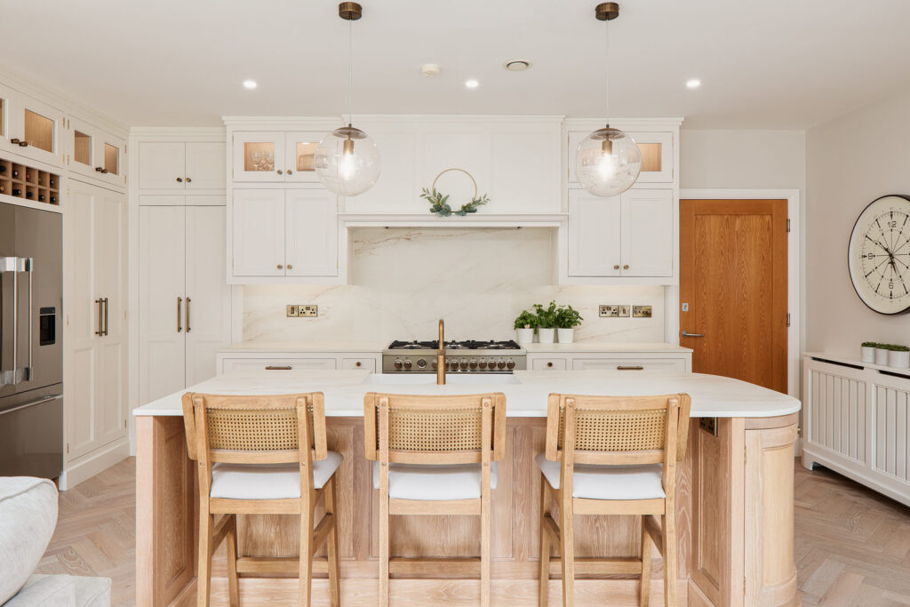 Where traditional craftsmanship meets contemporary design, featuring a curved oak island and a handmade canopy above the cooker.