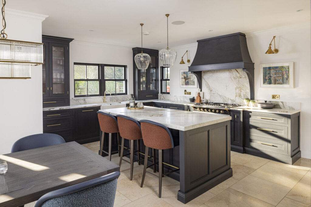 This stunning handmade kitchen has been painted in Basalt from Little Greene, making a real impact in the space.