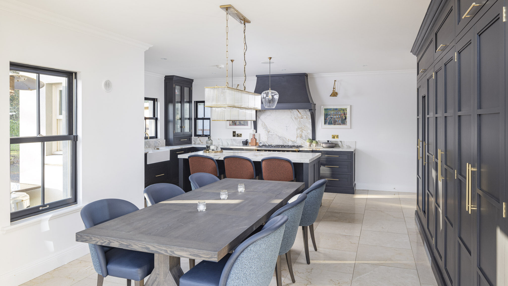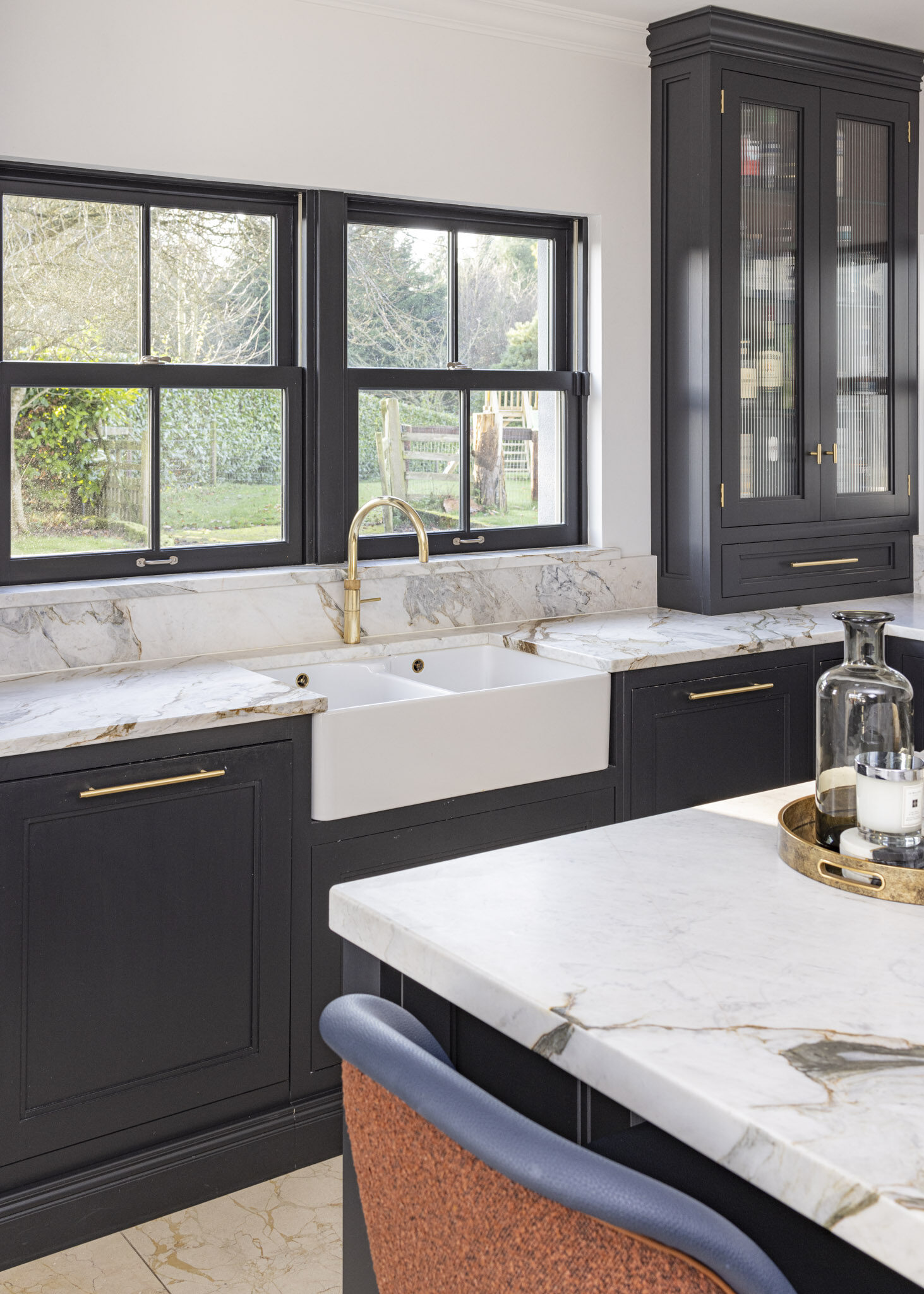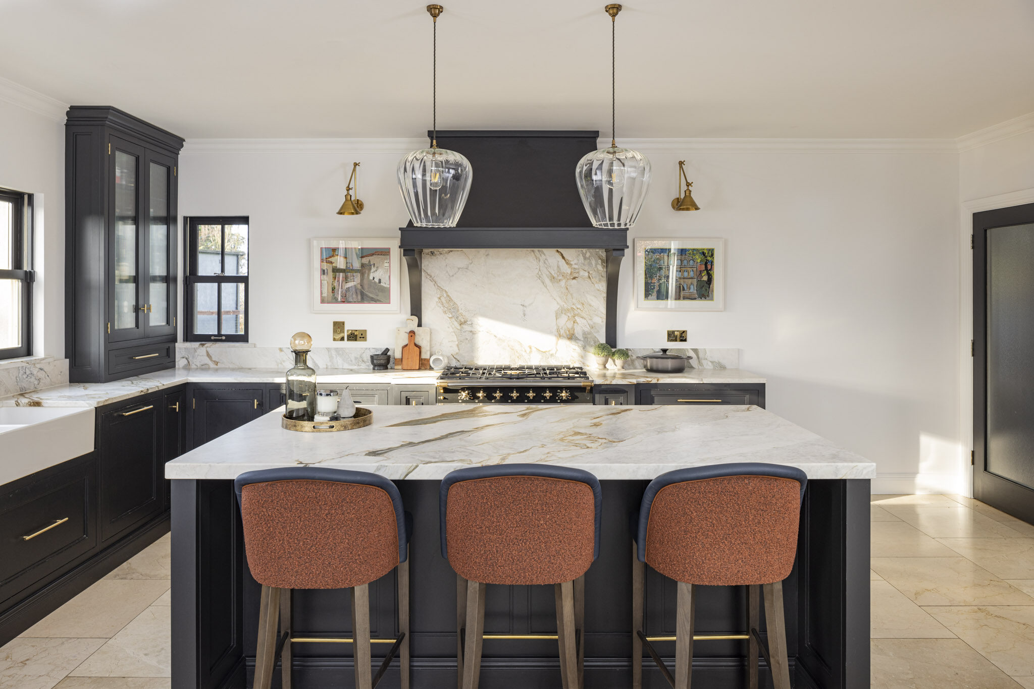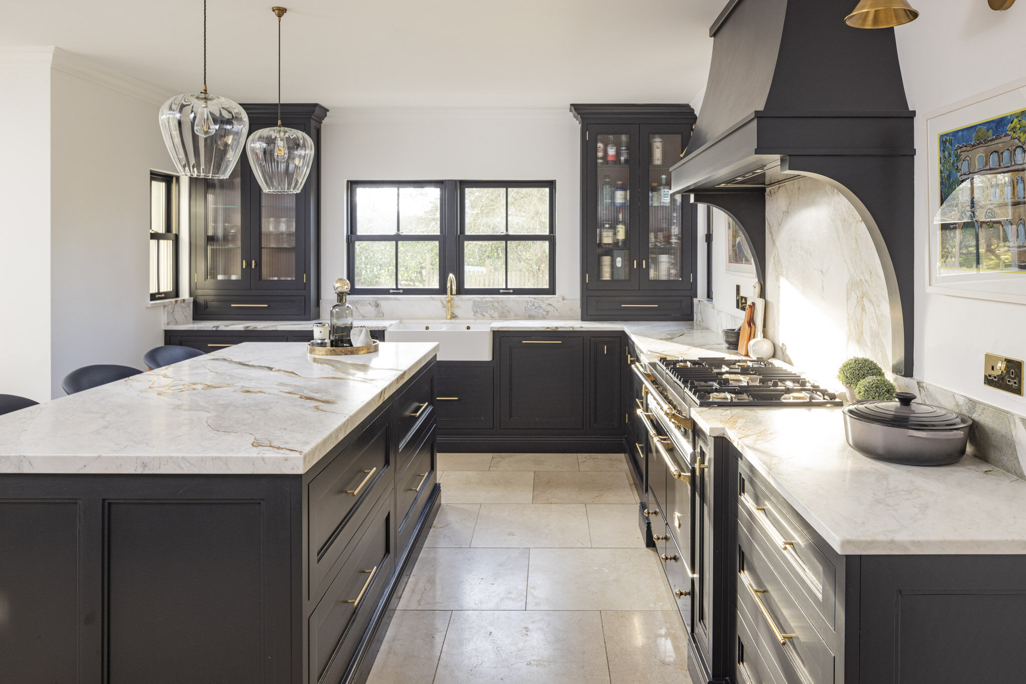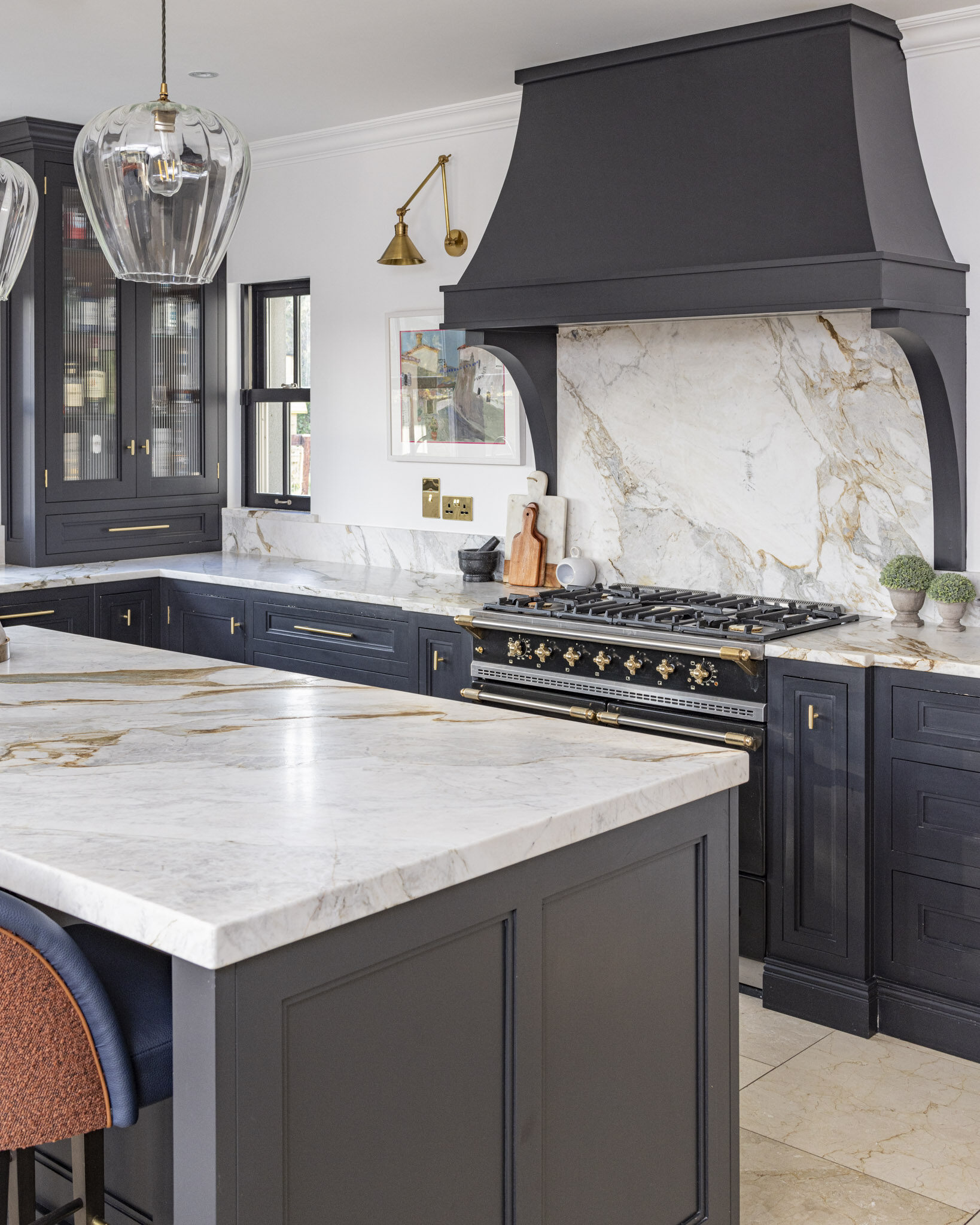 This Knightsbridge kitchen is all about drama and impact. The bold colour palette and tall, commanding cabinets create a striking visual impression, while the handmade canopy above the Lacanche cooker adds a refined focal point. Glass-fronted cabinets either side of the window introduce light and display, and luxurious marble worktops complete the look, balancing opulence with practicality.