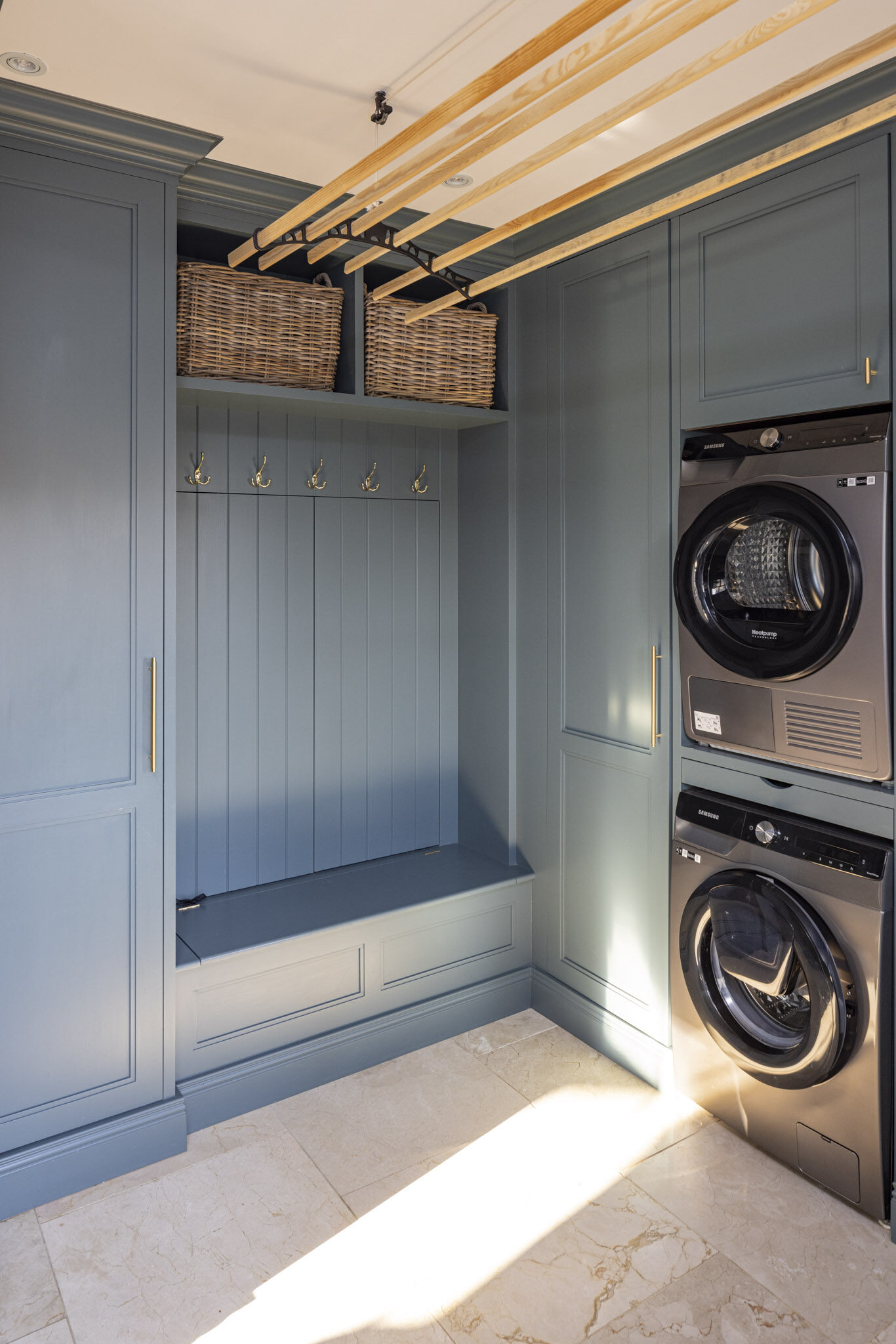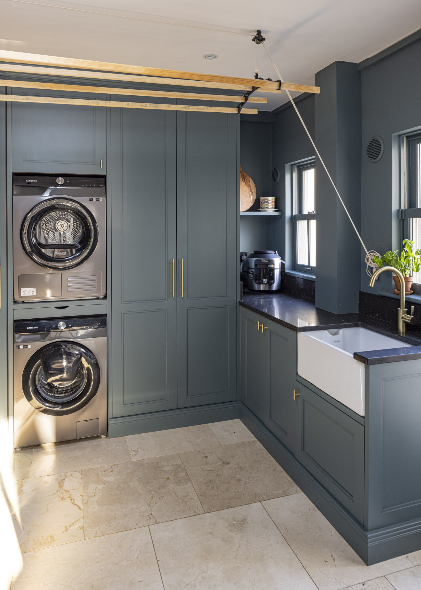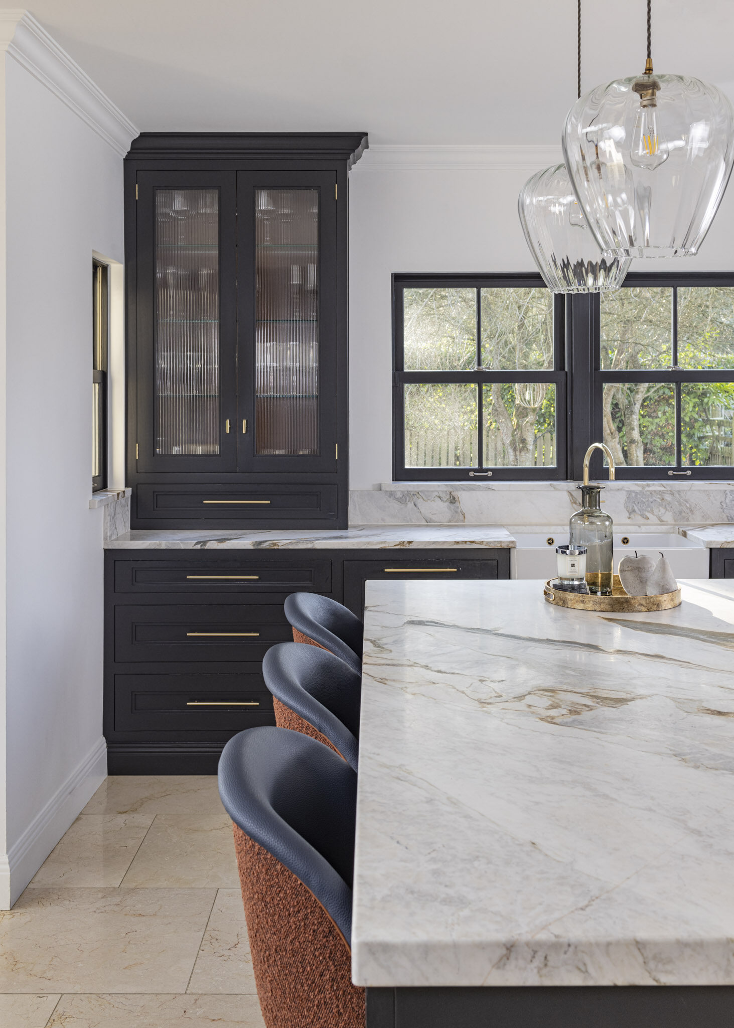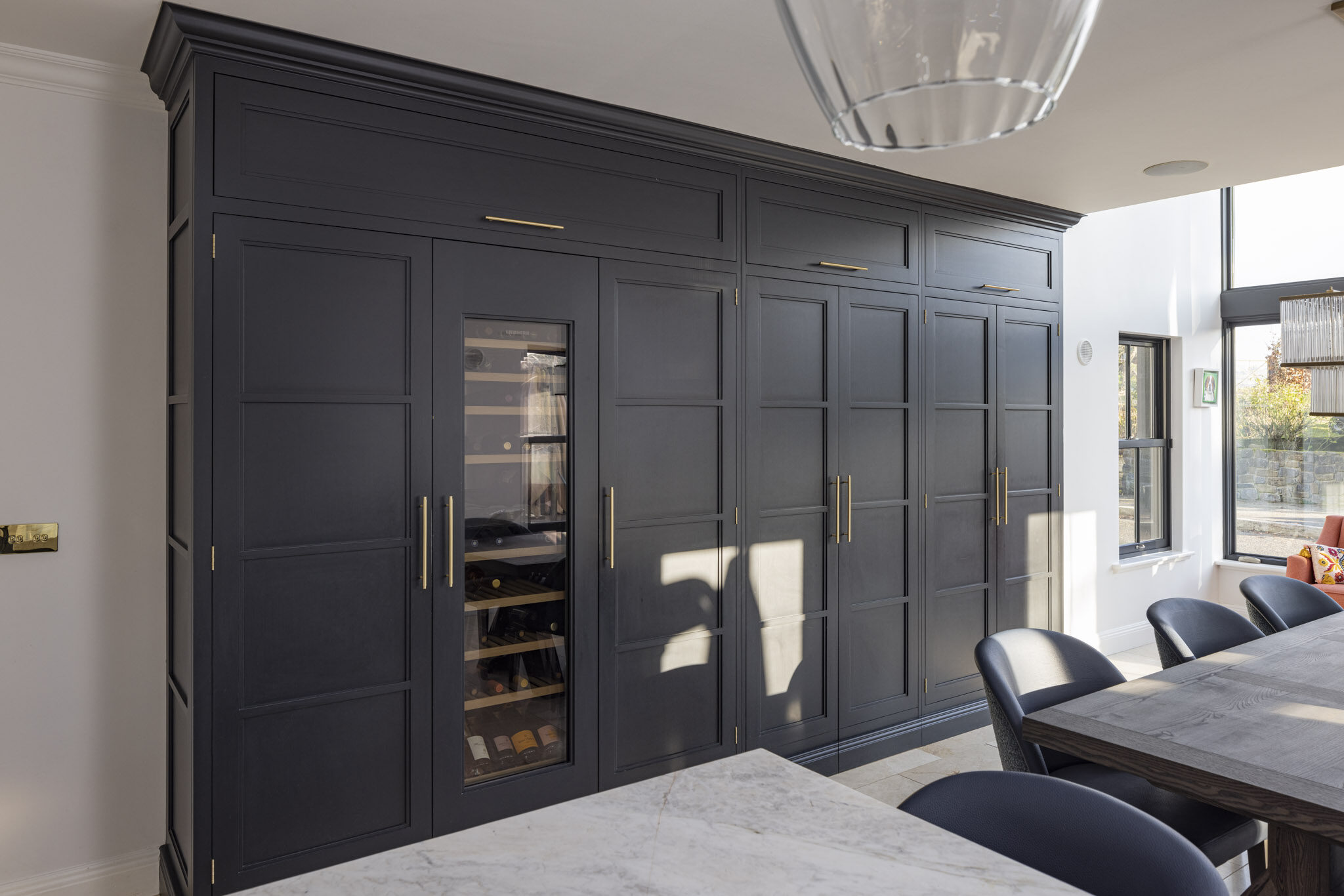 Our team ensured that design and function were seamlessly combined. Secret doors within the tall cabinets lead to the utility, keeping the main kitchen uncluttered, while the integrated tall wine cooler provides effortless entertaining convenience. Every detail, from cabinet finishes to the placement of storage and appliances, was tailored to maximise usability without compromising style.